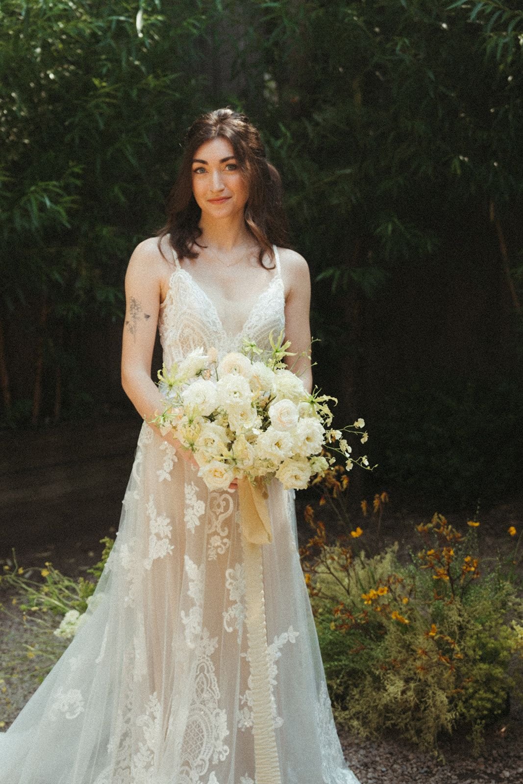 The romance extended well beyond the venue. Our bride wore a sheer lace gown and the ceremony site was surrounded by sprays of roses, forsythia, vibrant gloriosa, and golden oncidium. Bold patterned linens adorned each table, and thoughtfully designed letterpress wedding paper set the tone from the very beginning.